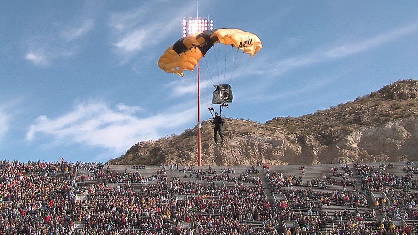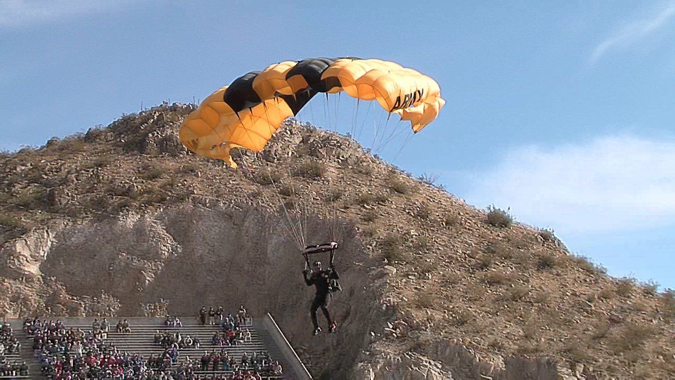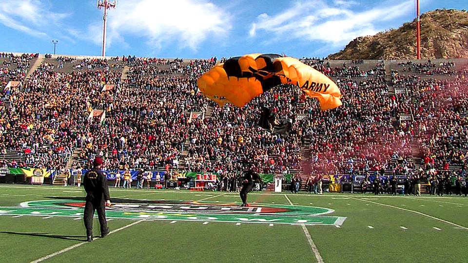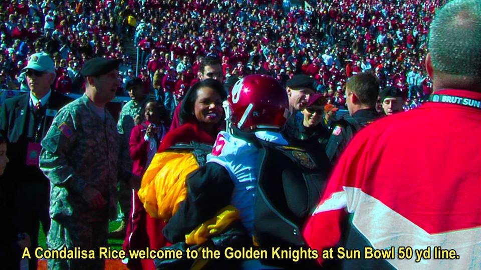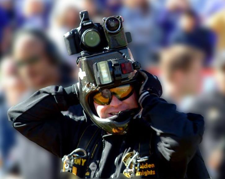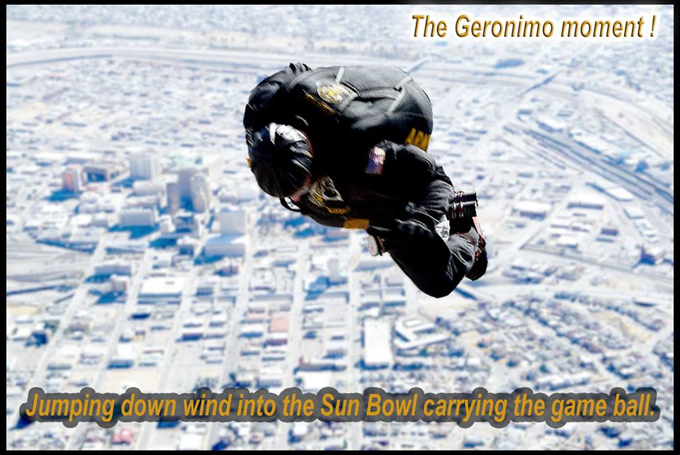 Vol 3: For several years in a row, I coordinated with the GK to cover the Sun Bowl jumps (a nationally televised Holiday event). I assigned ASG photogs to the jump plane, ICE Black Hawk helo and to key areas of the football field itself. Having cleared DHS and Sun Bowl security, ASG photogs covered the US flag and "game ball" jumps from the GK plane to the 50 yd line LZ, and then the "coin toss" to start the game. Later, I was within 10 ft of Rhianna for the national anthem, and other celebs and VIP's for the half-time performance and more. Our coverage required an understanding of commercial network protocols, precise timing and logistics. If we' weren't on point, the opp would have been lost. But not a problem for ASG. We're used to coverage fighter jets at 700mph within 200 ft. Yeah-ha>